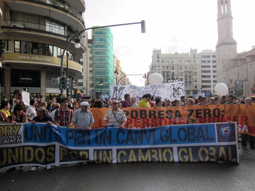 Decenas de miles de 'indignados' han salido este sábado a la calle en Valencia bajo el lema 'Unidos por un cambio global', en el marco de la marcha simultánea convocada en 80 países para reclamar un viraje en las políticas sociales, económicas y políticas de los Estados.